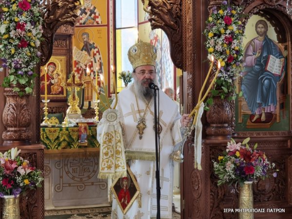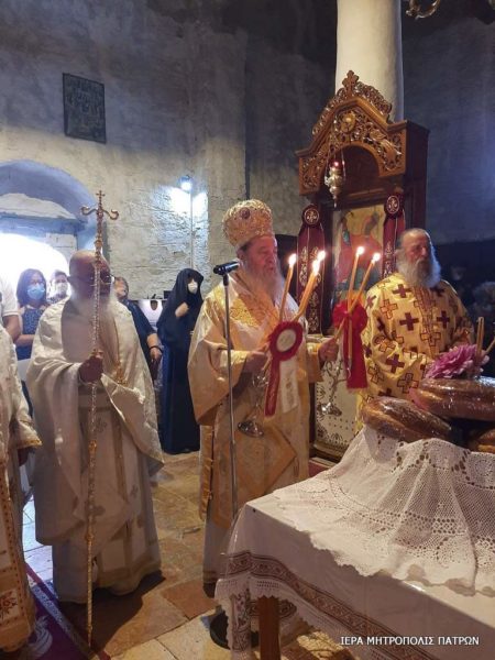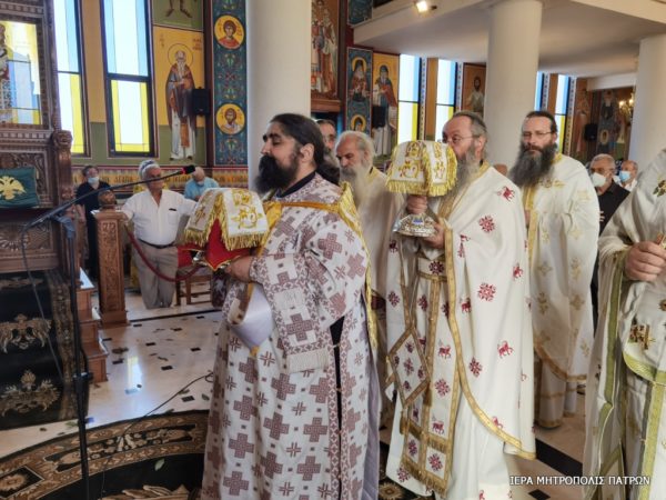 Ανήμερα, 17.7.2021, στον κατάμεστο από πιστούς Ιερό Ναό, τελέσθηκε η Θεία Λειτουργία υπό του Σεβασμιωτάτου Μητροπολίτου Πατρών κ. Χρυσοστόμου, ο οποίος στο κήρυγμά του μίλησε για την νίκη των Αγίων εναντίον των ορατών και αοράτων εχθρών και κυρίως εναντίον της φιληδονίας, της φιλοδοξίας και της φιλαργυρίας.