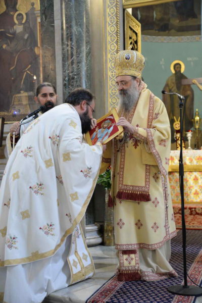 Ο Σεβασμιώτατος στην ομιλία του, αναφέρθηκε στη θυσία των Αγίων Εθνοϊερομαρτύρων Χρυσοστόμου Σμύρνης και λοιπών Αρχιερέων και Κληρικών που μαρτύρησαν κατά την Μικρασιατική καταστροφή, αφού η Εκκλησία τιμά την μνήμη τους την Κυριακή προ της Υψώσεως του Τιμίου και Ζωοποιού Σταυρού.
