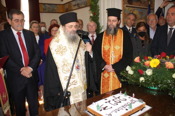 Μετά την Δοξολογία ο Σεβασμιώτατος, μετά των άλλων επισήμων, μετέβησαν πεζοί στο Δημαρχείο των Πατρών, όπου έτυχαν άπαντες θερμής υποδοχής από τον Δήμαρχο Πατρέων κ. Κωνσταντίνο Πελετίδη. Ο Σεβασμιώτατος ευλόγησε και έκοψε την Βασιλόπιτα και ευχήθηκε για το νέο έτος στον Δήμαρχο και τους Συνεργάτες του, υγιεία και ευλογία από τον Θεό προς επιτέλεση του ευθυνοφόρου έργου τους, μάλιστα σε καιρούς που έχουν ιδιαίτερες απαιτήσεις αφού καλούμεθα να διαχειρισθούμε προβλήματα, όπως η φτώχεια, η ανεργία, το δημογραφικό κ.λ.π. Ανέφερε δε και τα περί της εν δικαιοσύνη κατανομής των αγαθών που μας δίδει ο Κύριος, υπενθυμίζοντας επ’ αυτού την διδασκαλία του Μεγάλου Βασιλείου.