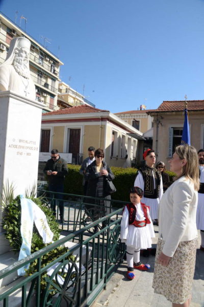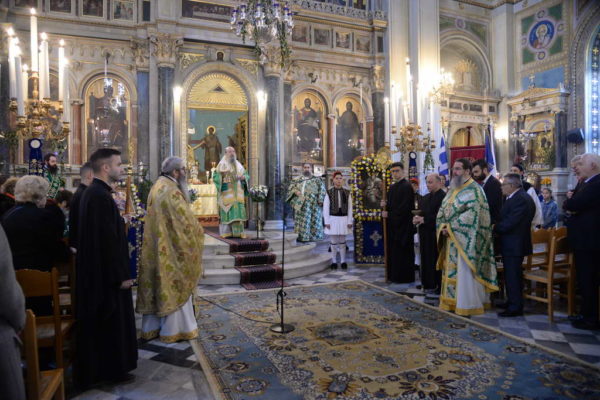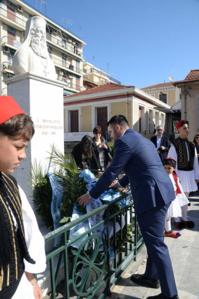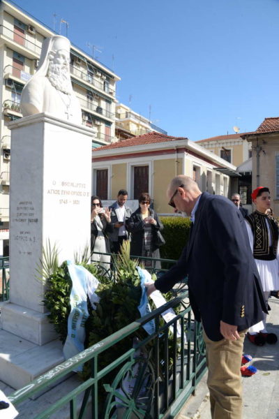 Ο Σεβασμιώτατος Μητροπολίτης Πατρών κ. Χρυσόστομος αναφέρθηκε με λόγους συγκινητικούς, στην θυσία του ιερού, υπέρ πίστεως και πατρίδος σφαγίου, του Αγίου Γρηγορίου του Ε’, του οποίου η θυσία, πυροδότησε έτι περαιτέρω, τον αγώνα των Ελλήνων για την ελευθερία. Επίσης μίλησε για το μαρτύριο του Αγίου ενδόξου Νεομάρτυρος Δημητρίου του εν Τριπόλει μαρτυρήσαντος το 1803 και του οποίου τα χαριτόβρυτα Λείψανα, ευρίσκονται στην Ιερά Μονή του Αγίου Νικολάου των Βαρσών, όπου ήτο Μοναχός και Ηγούμενος ο Σεβασμιώτατος και τέλος μίλησε με θερμά λόγια για τον αγώνα των Κυπρίων για την ελευθερία τους, τονίζοντας ότι αποτελεί ντροπή για την ανθρωπότητα σήμερα, η αδικία προς την Κύπρο, το να έχουμε δηλ. το 37% του Κυπριακού εδάφους κατεχόμενο, από τους Τούρκους εισβολείς, από το 1974 μέχρι σήμερα. Η επίλυση του Κυπριακού προβλήματος και η άρση της μεγίστης αυτής αδικίας, αποτελεί χρέος όχι μόνο των μεγάλων της γης, αλλά ολοκλήρου του κόσμου.