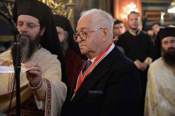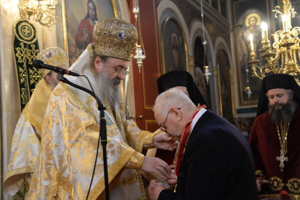 Στο τέλος της Θείας Λειτουργίας ετίμησε με το παράσημο του Αγίου Αποστόλου Ανδρέου, τον μεγάλο ευεργέτη της τοπικής μας Εκκλησίας, Ιατρό κ. Πέτρο Σπυρόπουλο, για την προσφορά του τόσο στην γενέτειρά του Κάτω Αχαία, όσο και στην Ιερά Μητρόπολη Πατρών και στον Ιερό Μητροπολιτικό Ναό Ευαγγελιστρίας, όσο και για άλλες ευεργεσίες του εκτός της Ιεράς Μητροπόλεώς μας.