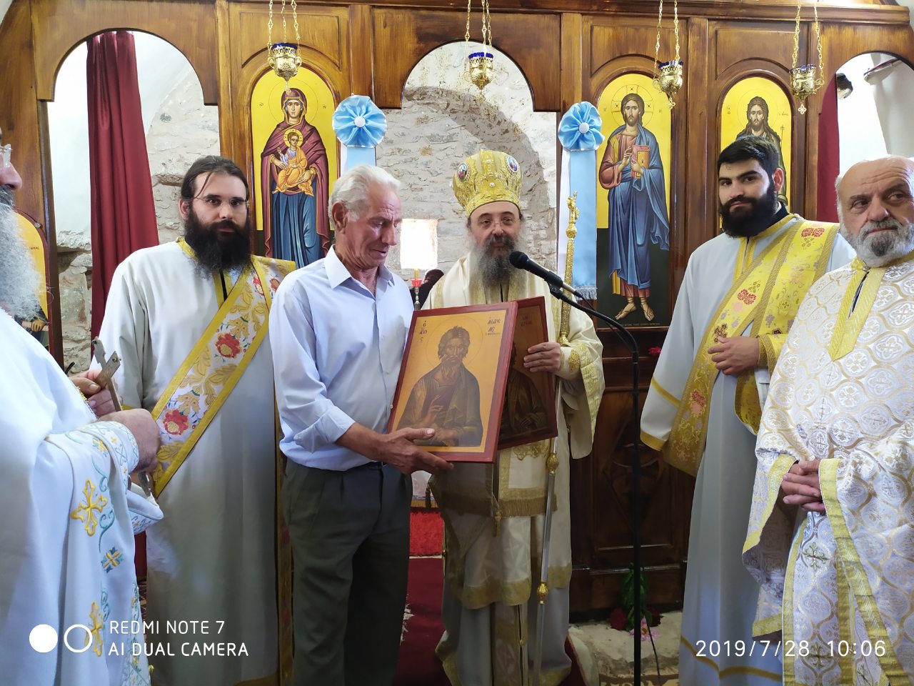 Στό τέλος τῆς Θείας Λειτουργίας ὁ Σεβασμιώτατος προσέφερε ἐκ μέρους τοῦ Ἐκκλησιαστικοῦ Συμβουλίου ἀπό μία εἰκόνα τοῦ Ἁγίου Ἀποστόλου Ἀνδρέου, στόν Πρόεδρο τοῦ Πολιτιστικοῦ Συλλόγου Λεοντίου, στόν Πρόεδρο τοῦ Συλλόγου Προστασίας Ὑγείας καί Περιβάλλοντος Περιοχῆς τοῦ Κέντρου Ὑγείας Χαλανδρίτσας, στόν Ἐκκλησιαστικό Ἐπίτροπο κ. Ἀνδρέα Καρβελᾶ καί στήν Δασκάλα τοῦ Δημοτικοῦ Σχολείου Λεοντίου.