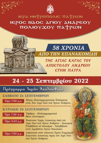 Την επέτειο 58 χρόνων από την Επανακομιδή της Τιμίας και Χαριτοβρύτου Κάρας του Αγίου ενδόξου Αποστόλου Ανδρέου στην Πάτρα, από την Ρώμη, όπου βρίσκονταν για περισσότερα από πεντακόσια χρόνια θα γιορτάσει η Πάτρα το Σαββατοκύριακο 24 και 25 Σεπτεμβρίου 2022.