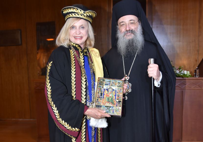 Επίσης, την ευχαρίστησε για το μήνυμα, το οποίο απέστειλε μαγνητοσκοπημένο, στην μεγάλη φιλανθρωπική συναυλία της Ιεράς Μητροπόλεως Πατρών, η οποία πραγματοποιήθηκε στο Παμπελοποννησιακό Στάδιο, με την ευκαιρία της συμπληρώσεως 100 ετών από την Μικρασιατική Καταστροφή, και της προσέφερε ιερά εικόνα του Αγίου Αποστόλου Ανδρέου, Πολιούχου Πατρών, ο Σταυρός του οποίου είναι το έμβλημα του Πανεπιστημίου Πατρών.