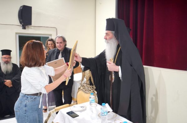 Στην συνέχεια ο Σεβασμιώτατος επέδωσε τιμητικό έπαινο σε δύο σπουδαστές οι οποίοι προετοιμάστηκαν από το Ωδείο μας, προκειμένου να εισαχθούν στο τμήμα μουσικολογίας του Πανεπιστημίου Αθηνών.