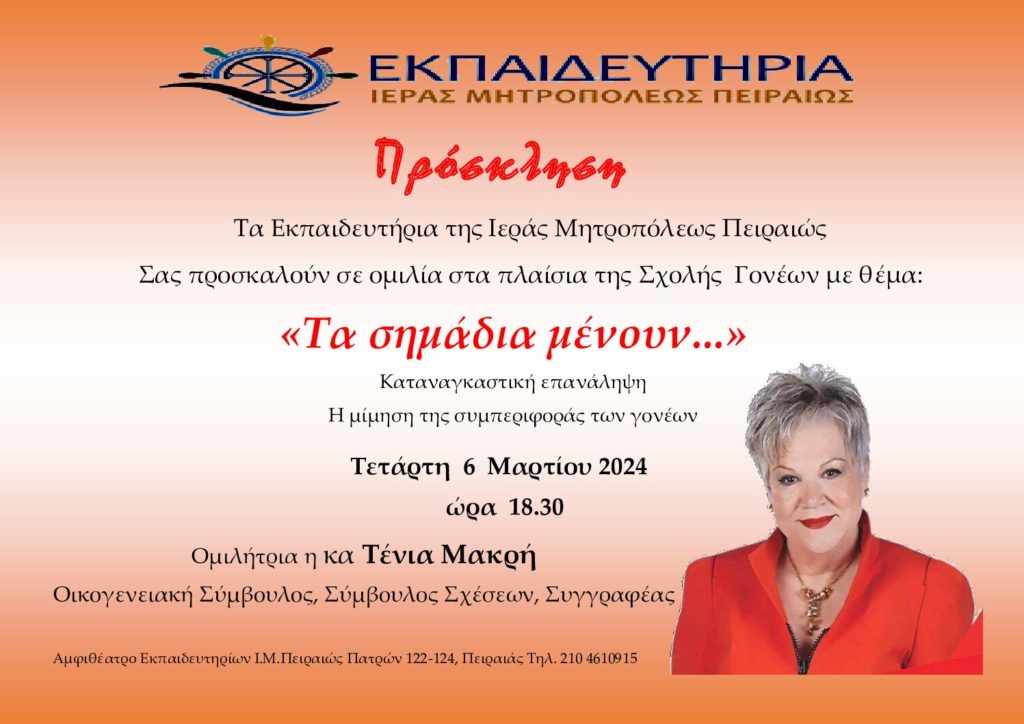 Προς αυτή την κατεύθυνση θα κινηθεί η εκδήλωση που θα πραγματοποιηθεί στο μεγάλο αμφιθέατρο των Εκπαιδευτηρίων Πειραιώς την Τετάρτη 6 Μαρτίου 2024, στις 18:30, με ομιλήτρια την κα Τένια Μακρή, οικογενειακή σύμβουλο, σύμβουλο σχέσεων και συγγραφέα, η οποία θα αναπτύξει το θέμα: «Τα σημάδια μένουν…Καταναγκαστική επανάληψη. Η μίμηση της συμπεριφοράς των γονέων».