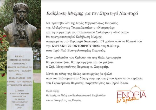 Με πρωτοβουλία της Ιεράς Μητροπόλεως Πειραιώς, της Αδελφότητας Τουρκολεκαίων ο «Nικηταράς» και τη συμμετοχή του Πολιτιστικού Συλλόγου η «Ενότητα» θα πραγματοποιηθεί Eκδήλωση Mνήμης, αφιερωμένη στο Στρατηγό Nικηταρά, 174 χρόνια από το θάνατό του την KYPIAKH 22 OKTΩBPIOY 2023 στις 9.30 π.μ. στον Iερό Nαό Eυαγγελιαστρίας Πειραιώς.