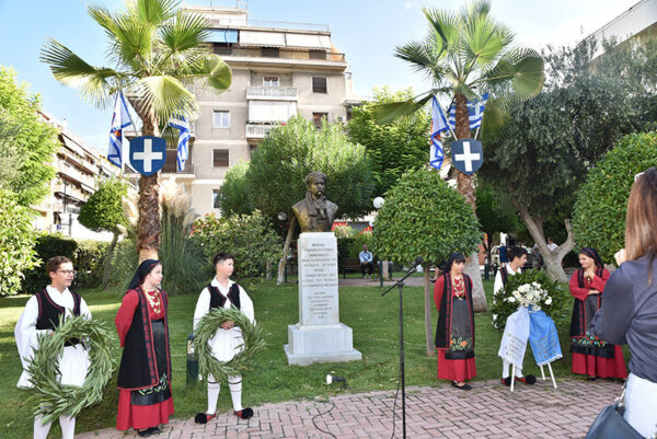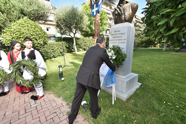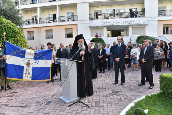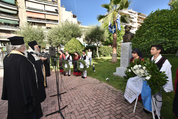 Μετά το τέλος της Θείας Λειτουργίας εψάλη από τον Σεβασμιώτατο δέηση στην προτομή του ήρωα στον περίβολο του Γηροκομείου Πειραιώς, παραπλεύρως του Ιερού Ναού και μετά τον σύντομο χαιρετισμό του ακολούθησε κατάθεση στεφάνων.