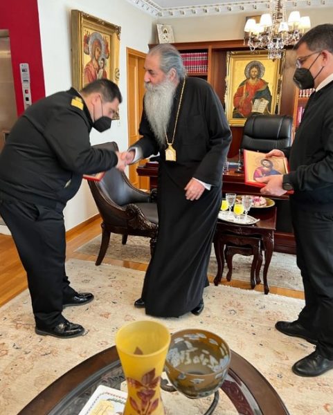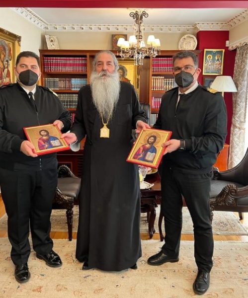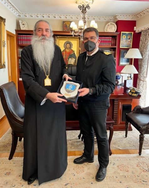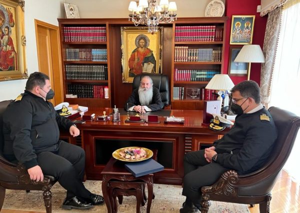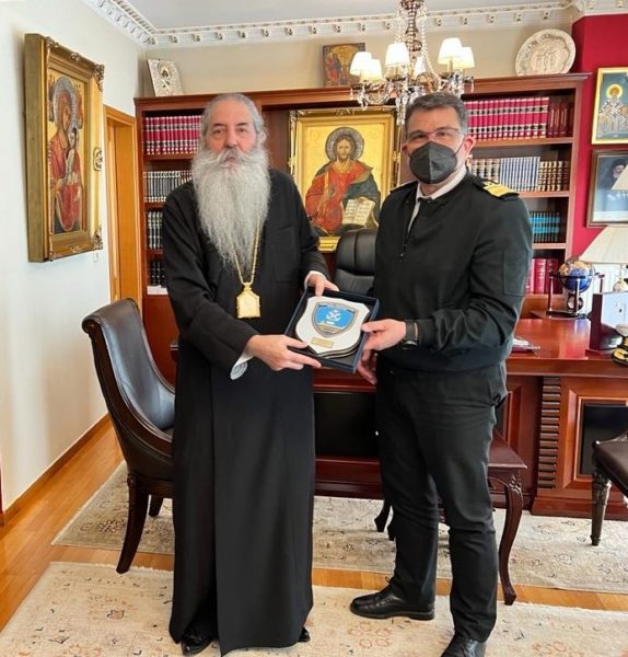 Ο απερχόμενος Λιμενάρχης Πειραιώς Υποναύαρχος Γεώργιος Σκανδάλης, ο οποίος αναλαμβάνει καθήκοντα Επιθεωρητή στο Αρχηγείο του Λιμενικού Σώματος και ο νέος Λιμενάρχης Πειραιώς, Αρχιπλοίαρχος Σπυρίδων Ευαγγελίδης επισκέφθηκαν σήμερα Τετάρτη 13 Απριλίου 2022 στα Γραφεία της Ιεράς Μητρόπολης, τον Σεβασμιώτατο Μητροπολίτη Πειραιώς κ. Σεραφείμ.