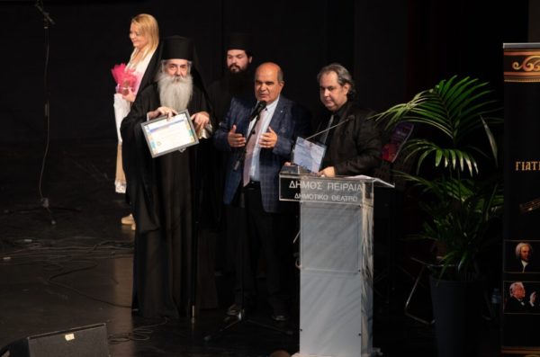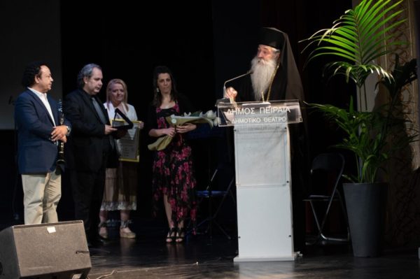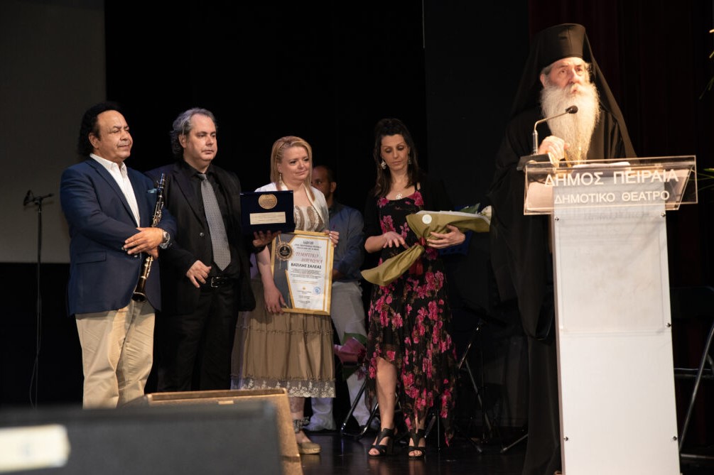 Τον λόγο έλαβε ο Σεβασμιώτατος Μητροπολίτης Πειραιώς κ. Σεραφείμ εξαίροντας το έργο και την προσφορά του κ. Βασίλη Σαλέα στην παγκόσμια μουσική και τον πολιτισμό, εκφράζοντας θερμές ευχαριστίες για την τιμής ένεκεν παρουσία του στη συναυλία του Ωδείου της Ι.Μ.Π. ενώ αμέσως μετά βραβεύθηκε από το Ωδείο και τον Σεβασμιώτατο με πλακέτα, δίπλωμα και το μετάλλιο του Μουσικού Ιδρύματος.