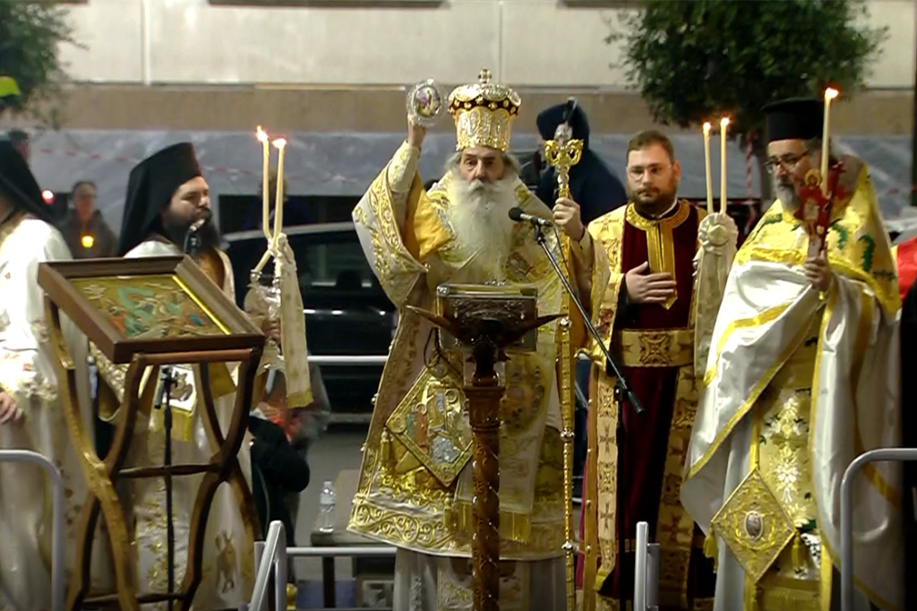 Μετά το «Δεύτε λάβετε Φως…» και την μετάδοση του Αγίου Φωτός, κλήρος και λαός με επικεφαλής τον Σεβασμιώτατο κατευθύνθηκαν στην ειδική εξέδρα που είχε τοποθετηθεί στον αύλειο χώρο του Καθεδρικού μας Ναού και εκφωνήθηκε η Πασχάλιος Ποιμαντορική Εγκύκλιος του Σεβασμιωτάτου από τον προϊστάμενο του Ναού Αρχιμανδρίτη π. Δανιήλ Ψωίνο.
