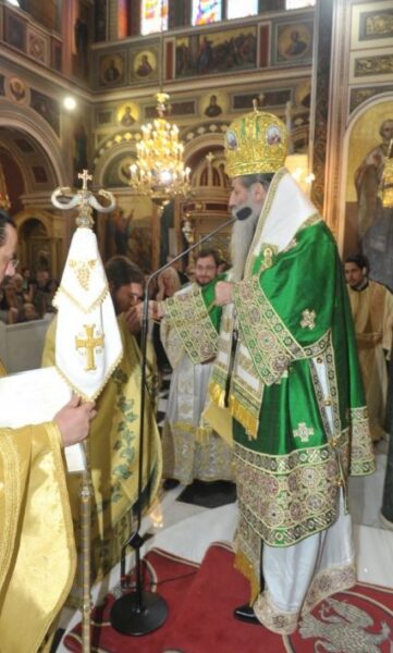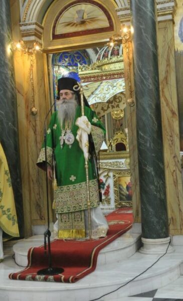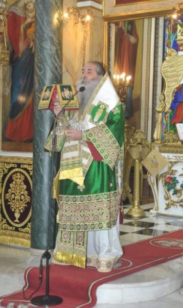 Κατά την διάρκεια του κηρύγματός του, ο Σεβασμιώτατος αναφέρθηκε αφενός στην ιστορία της Ιεράς Εικόνος της Παναγίας Τριχερούσης, αφετέρου στις δύσκολες στιγμές που βιώνουμε και διανύουμε και στο θλιβερό γεγονός της μετατροπής της Μεγάλης του Χριστού Εκκλησίας, του Ναού που ο Αυτοκράτορας Ιουστινιανός ανήγειρε, σε Μουσουλμανικό τέμενος.