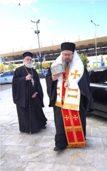 Το Ιερό Σέβασμα, το οποίο υποδέχθηκε ο Σεβασμιώτατος Μητροπολίτης Πειραιώς κ. Σεραφείμ, κόμισε στην τοπική Εκκλησία του Πειραιά ο Σεβασμιώτατος Μητροπολίτης Λαρίσης και Τυρνάβου κ.Ιερώνυμος, ο οποίος χοροστάτησε στην Δοξολογία που τελέστηκε μετά την υποδοχή της Τιμίας Κάρας.