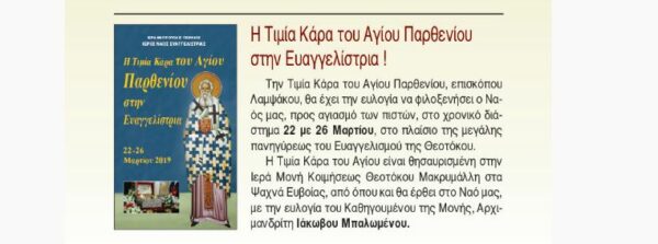 Την Τίμια Κάρα του Αγίου Παρθενίου, Επισκόπου Λαμψάκου, θα έχει την ευλογία να φιλοξενήσει ο Ιερός Ναός Ευαγγελίστριας Πειραιώς, κατά το χρονικό διάστημα 22 με 26 Μαρτίου 2019, στο πλαίσιο της μεγάλης πανηγύρεως του Ευαγγελισμού της Θεοτόκου.