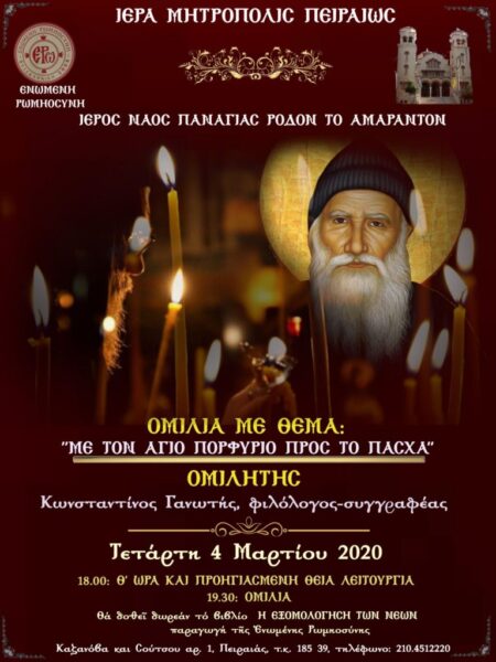 Η “Ενωμένη Ρωμηοσύνη” και ο ιερός ναός Παναγίας Ρόδον το Αμάραντον, της Ιεράς Μητροπόλεως Πειραιώς, μάς προσκαλούν σε ομιλία με θέμα: “Με τον Άγιο Πορφύριο προς το Πάσχα”. Το θέμα θα αναπτύξει ο φιλόλογος- συγγραφέας κ. Κωνσταντίνος Γανωτής. Η εκδήλωση θα πραγματοποιηθεί την Τετάρτη 4 Μαρτίου 2020 και ώρα 19:30 στον ιερό ναό της Παναγίας Ρόδον το Αμάραντον. Θα προηγηθεί στις 18:00 η Θ’ ώρα και η Λειτουργία των Προηγιασμένων Δώρων.