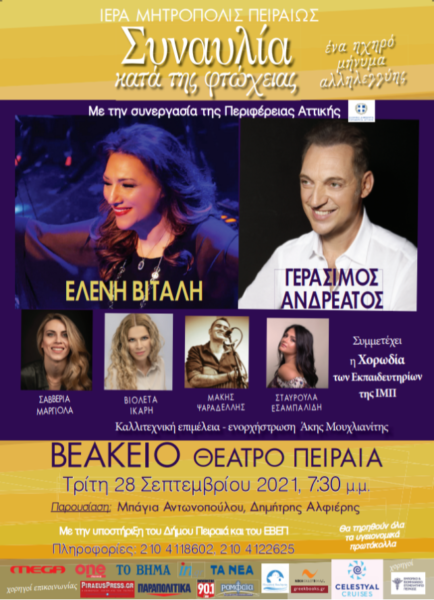 Με την παρουσία του Νίκου Θεοδωράκη, γιου του αειμνήστου μεγάλου Έλληνα μουσικοσυνθέτη Μίκη Θεοδωράκη θα πραγματοποιηθεί την Τρίτη 28 Σεπτεμβρίου 2021, στις 19:30 στο Βεάκειο ανοιχτό Θέατρο Πειραιά, η συναυλία κατά της φτώχειας που διοργανώνει η Ι.Μητρόπολη Πειραιώς σε συνεργασία με την Περιφέρεια Αττικής και την υποστήριξη του Δήμου Πειραιά και του Ε.Β.Ε.Π.