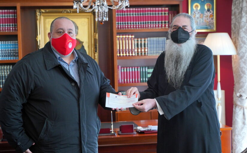Επιταγή αξίας 10.000 ευρώ για την ενίσχυση του φιλανθρωπικού έργου της τοπικής μας Εκκλησίας, παρέδωσε σήμερα Παρασκευή 18 Δεκεμβρίου 2020 εκ μέρους του ηγέτη και ιδιοκτήτη του Ολυμπιακού κ.Ευάγγελου Μαρινάκη στον Σεβασμιώτατο Μητροπολίτη Πειραιώς κ. Σεραφείμ, ο Αντιπρόεδρος του Ο.Σ.Φ.Π. κ. Κωσταντίνος Καραπαπάς.