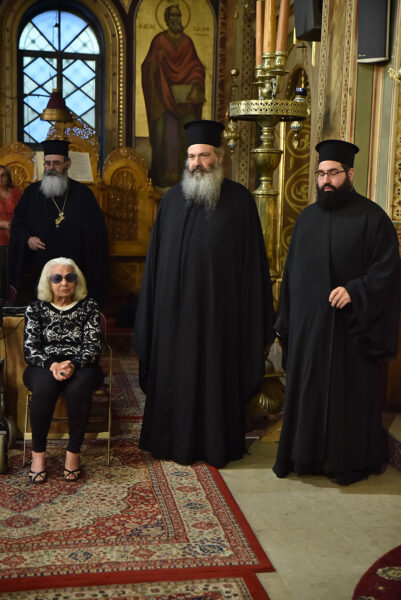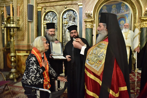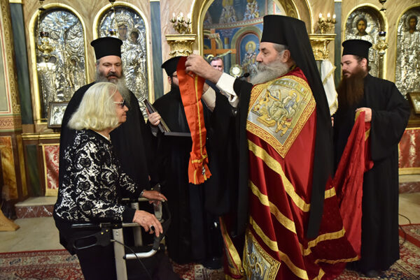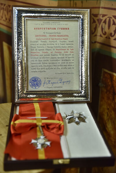 Μετά το πέρας του Μεγάλου Εσπερινού, ο Σεβασμιώτατος τίμησε την μεγάλη ευεργέτιδα της Ιεράς Μητροπόλεως Πειραιώς και λογοτέχνη, κα Αντιόπη Μανιάτη με την ύψιστη τιμητική διάκριση της Μητροπόλεως, τον μεγαλόσταυρο του πολιούχου αγίου Σπυρίδωνα.