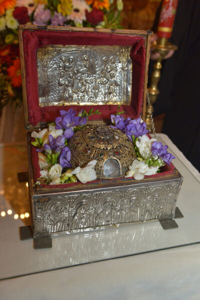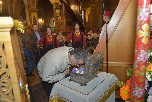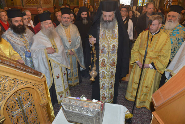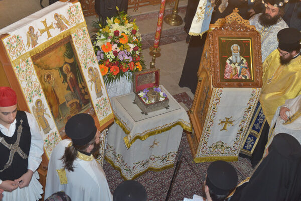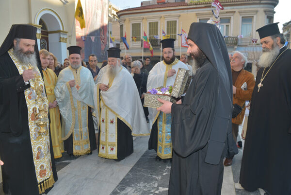 Ο π. Νήφων, μετέφερε τις ευχές και τις ευχαριστίες του Σεβασμιωτάτου, τόσο προς τον Σεβασμιώτατο Μητροπολίτη Χαλκίδος κ. Χρυσόστομο, για την άδεια της μεταφοράς της Τιμίας Κάρα, όσο και προς τον Καθηγούμενο της Ιεράς Μονής Κοιμήσεως Θεοτόκου Μακρυμάλλη Ευβοίας, Αρχιμανδρίτη Ιάκωβο Μπαλωμένο και τον Ιεροδιάκονο της Μονής π. Τιμόθεο, που μετέφερε αυτόν τον μεγάλο θησαυρό.