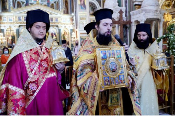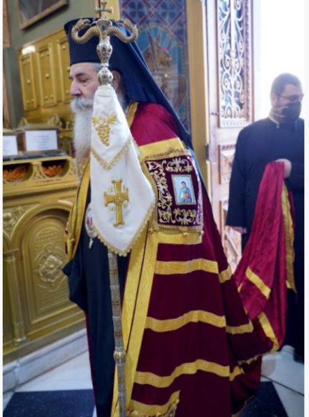 Προ της Απολύσεως της Θείας Λειτουργίας, πραγματοποιήθηκε η περιφορά της Ιεράς Εικόνος στον αύλειο χώρο πέριξ του Μητροπολιτικού Ιερού Ναού, την οποία, λόγω των υγειονομικών μέτρων, ακολούθησαν μόνο ο Σεβασμιώτατος Μητροπολίτης μας και οι Ιερείς του Ναού.