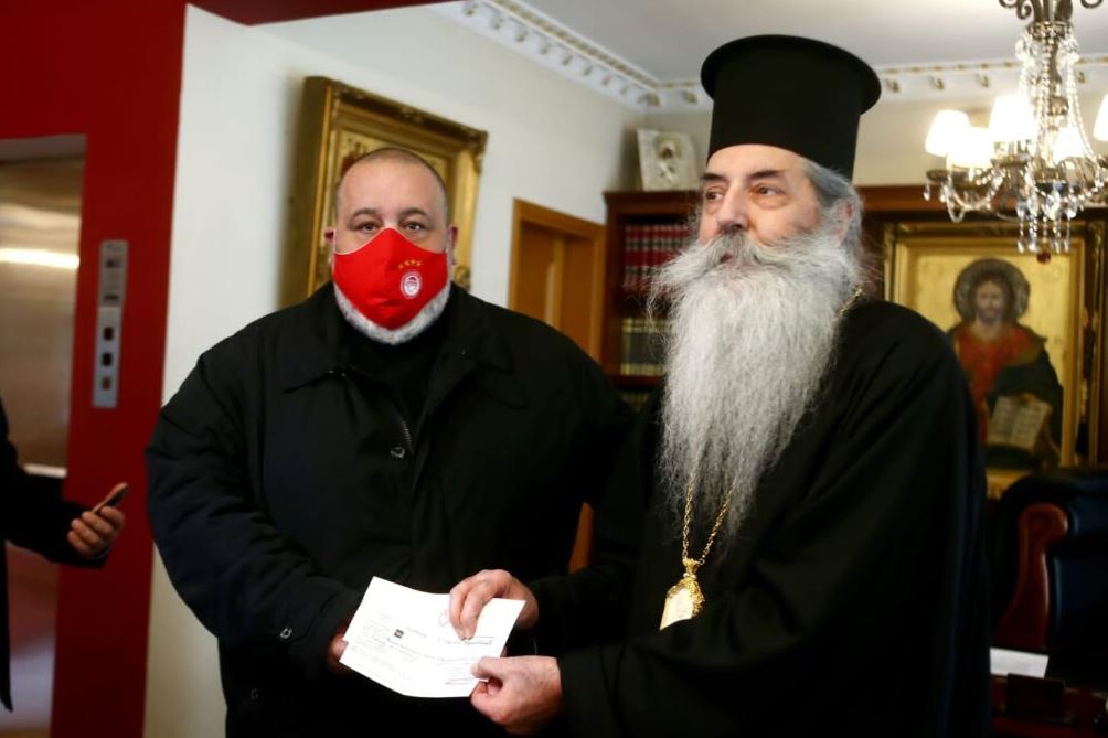 Την επιταγή παρέδωσε σήμερα Μεγάλη Δευτέρα 18 Απριλίου 2022 στον Σεβασμιώτατο Μητροπολίτη Πειραιώς κ. Σεραφείμ, ο αντιπρόεδρος του Ολυμπιακού κ. Κώστας Καραπαπάς, ο οποίος βρέθηκε για το λόγο αυτό στα γραφεία της Ιεράς Μητροπόλεως Πειραιώς.