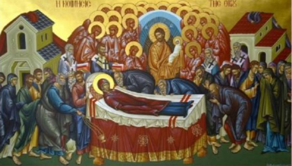Κι έρχεται τέλος η ημέρα η σημερινή, αυτή της Κοιμήσεως της Θεοτόκου, να μας φέρει σε μια παντελώς διαφορετική θεώρηση του θανάτου. Γιορτάζουμε την παρούσα ημέρα πανηγυρικά, τη νίκη επί του θανάτου. Πέρασμα έγινε ο θάνατος, από τούτη τη ζωή στην άλλη, από τον πόνο στην μακαριότητα, από την φθορά στην αφθαρσία, από το εφήμερο στο αιώνιο. Από τη μία βλέπουμε στην εικόνα της Κοιμήσεως της Θεοτόκου τον ίδιο τον Χριστό να αγκαλιάζει στοργικά τη ψυχή της Αγίας Μητρός Του. Από την άλλη συνεορτάζουμε την ημέρα αυτή το γεγονός της μεταστάσεως της Θεοτόκου, της αναστάσεως Της δηλαδή από το Χριστό. Το άσπιλο σώμα της Παναγίας δεν εγκαταλείπεται ούτε αυτό στη φθορά. Η ψυχή και το σώμα του ανθρώπου στα χέρια του Θεού. Η Κυρία Θεοτόκος είναι η πρώτη που δέχθηκε τούτο το δώρο της ζωής, το οποίο ο Λυτρωτής Χριστός προορίζει για τον κάθε άνθρωπο που σχετίζεται μαζί Του.