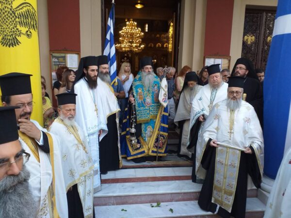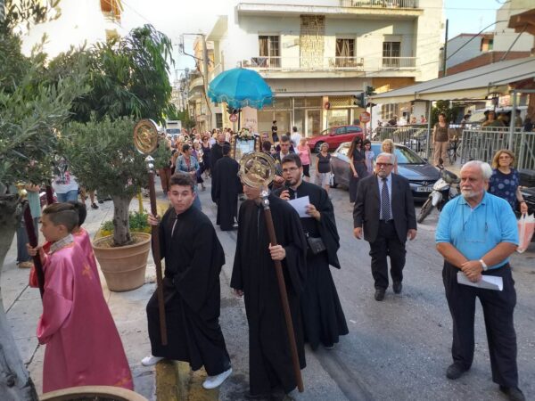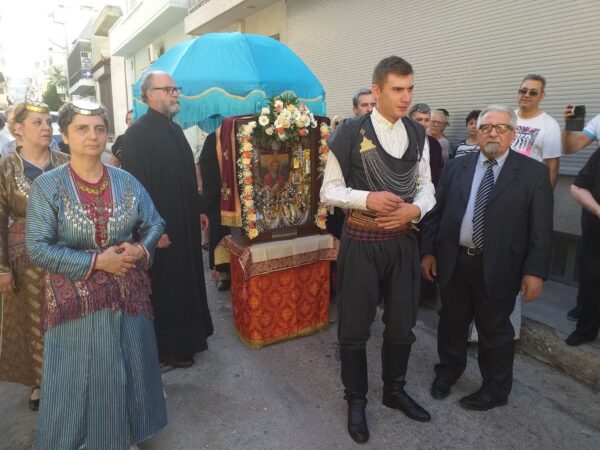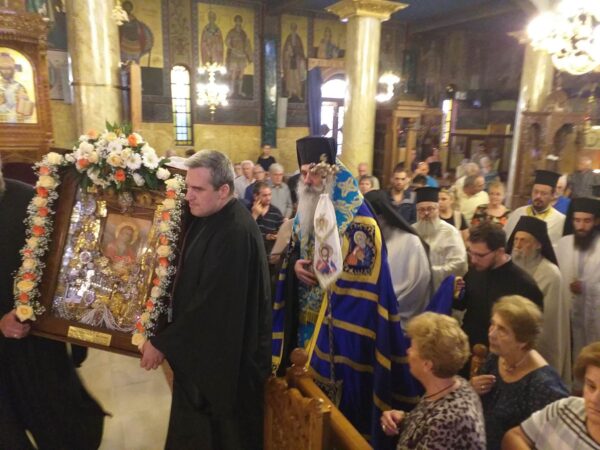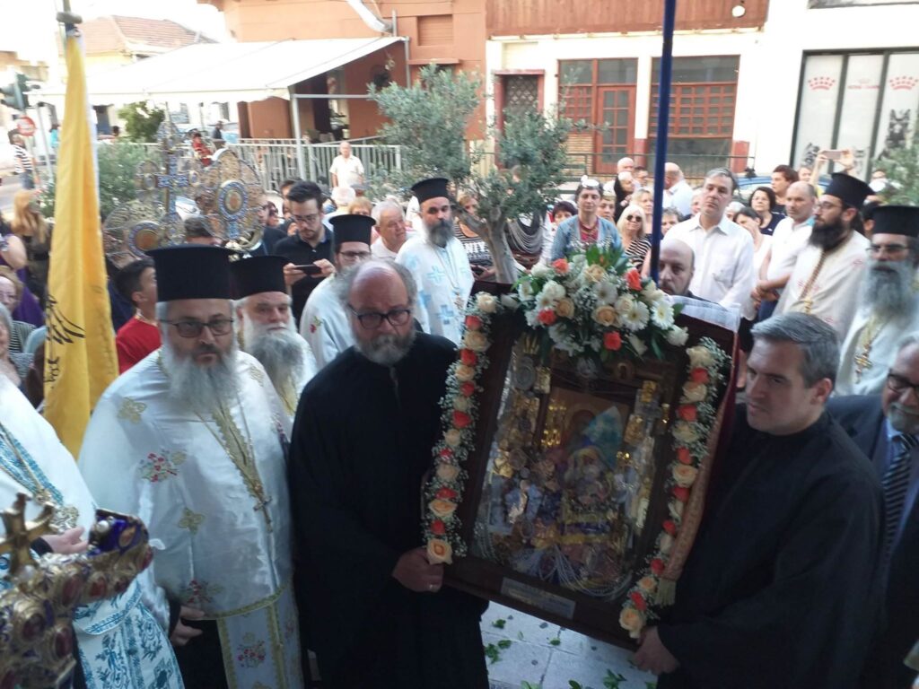 Η Ιερά Εικόνα γεμάτη τάματα από πιστούς και αφιερώματα Ιερέων και Επισκόπων μεταφέρθηκε από την οικία του κ. Ιωάννη στον Ιερό Ναό με λιτανευτική πομπή.