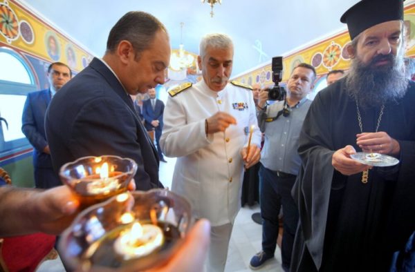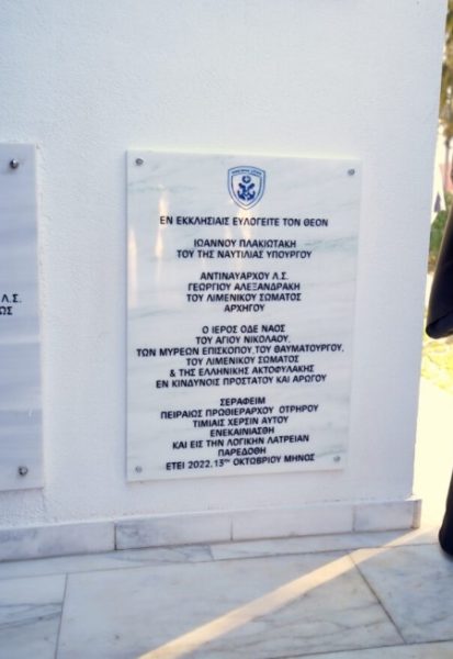 «Η Χάρη του Θεού έρχεται σήμερα και σκηνώνει σε αυτό το χώρο και, όπως λένε οι Πατέρες, Άγγελοι πλέον θα βρίσκονται εδώ για να προφυλάξουν τον ιερό αυτό χώρο», επεσήμανε, ολοκληρώνοντας το κήρυγμά του ο Σεβασμιώτατος και εκφράζοντας για μία ακόμη φορά τις άπειρες ευχαριστίες του στον υπουργό κ. Πλακιωτάκη, στον υφυπουργό κ. Κατσαφάδο, στον Γενικό Γραμματέα, σε όλους τους συνεργάτες τους, καθώς και στον Αρχηγό του Λιμενικού Σώματος Αντιναύαρχο Γεώργιο Αλεξανδράκη, στους Υπαρχηγούς, αλλά και στους άνδρες και τις γυναίκες του Λ.Σ. – Ελληνικής Ακτοφυλακής που «δίνουν μαρτυρία δημοκρατίας, ελευθερίας, αδελφοσύνης στα νερά του Αιγαίου» «και που διασφαλίζουν το μέγεθος και το μεγαλείο του Μεγάλου των Ελλήνων Κράτους της θαλάσσης και της Εμπορικής μας Ναυτιλίας που είναι πυλώνας της οικονομίας και της κοινωνικής μας διαρθρώσεως».