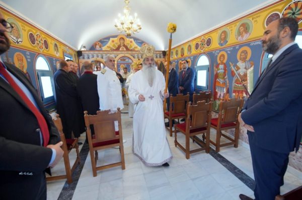«Η Χάρη του Θεού έρχεται σήμερα και σκηνώνει σε αυτό το χώρο και, όπως λένε οι Πατέρες, Άγγελοι πλέον θα βρίσκονται εδώ για να προφυλάξουν τον ιερό αυτό χώρο», επεσήμανε, ολοκληρώνοντας το κήρυγμά του ο Σεβασμιώτατος και εκφράζοντας για μία ακόμη φορά τις άπειρες ευχαριστίες του στον υπουργό κ. Πλακιωτάκη, στον υφυπουργό κ. Κατσαφάδο, στον Γενικό Γραμματέα, σε όλους τους συνεργάτες τους, καθώς και στον Αρχηγό του Λιμενικού Σώματος Αντιναύαρχο Γεώργιο Αλεξανδράκη, στους Υπαρχηγούς, αλλά και στους άνδρες και τις γυναίκες του Λ.Σ. – Ελληνικής Ακτοφυλακής που «δίνουν μαρτυρία δημοκρατίας, ελευθερίας, αδελφοσύνης στα νερά του Αιγαίου» «και που διασφαλίζουν το μέγεθος και το μεγαλείο του Μεγάλου των Ελλήνων Κράτους της θαλάσσης και της Εμπορικής μας Ναυτιλίας που είναι πυλώνας της οικονομίας και της κοινωνικής μας διαρθρώσεως».