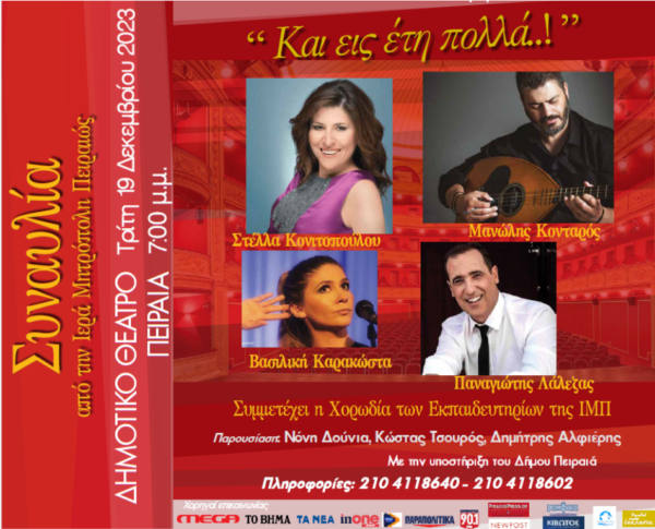 Με ουσιαστικό στόχο να μπορέσουμε και αυτά τα Χριστούγεννα να ανταποκριθούμε στις πολλές απαιτήσεις όσων βιώνουν την απόλυτη φτώχεια, η Ιερά Μητρόπολη Πειραιώς, με την υποστήριξη του Δήμου Πειραιά, διοργανώνει για μία ακόμη χρονιά, την Τρίτη 19 Δεκεμβρίου 2023 στις 19:00, μεγάλη Φιλανθρωπική Συναυλία στο Δημοτικό Θέατρο της πόλης με γενικό τίτλο «…και εις έτη πολλά»!