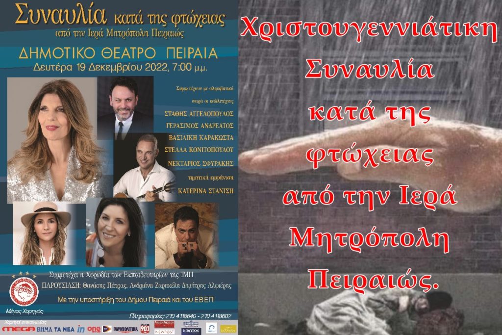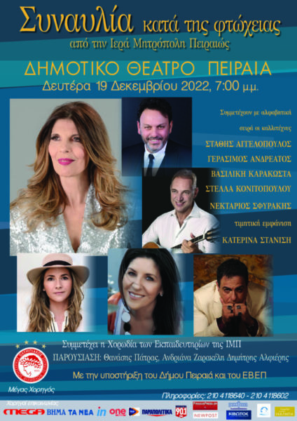 Με ουσιαστικό στόχο να μπορέσουμε και αυτά τα Χριστούγεννα να ανταποκριθούμε στις πολλές απαιτήσεις όσων βιώνουν την απόλυτη φτώχεια, η Ι.Μητρόπολη Πειραιώς διοργανώνει για μία ακόμη χρονιά, την Δευτέρα 19 Δεκεμβρίου 2022 στις 19:00, μεγάλη Φιλανθρωπική Συναυλία στο Δημοτικό Θέατρο Πειραιώς.