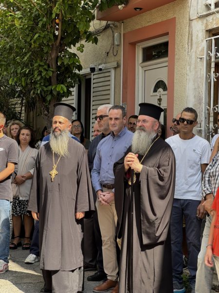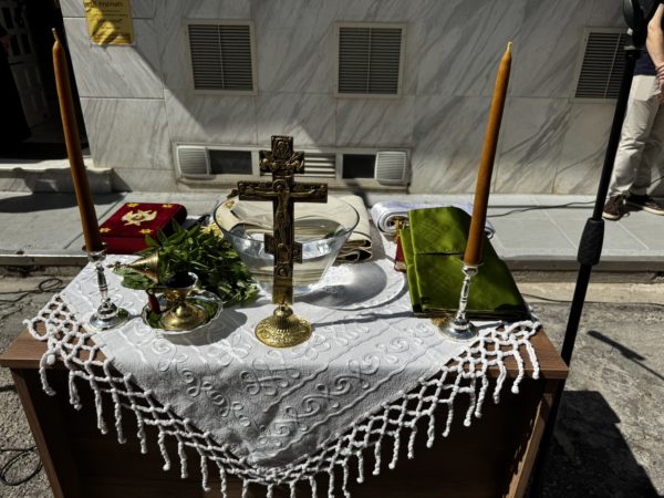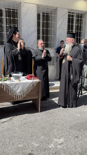 Την Ακολουθία του Αγιασμού τέλεσε ο Θεοφιλέστατος Επίσκοπος Κλαυδιουπόλεως κ. Ιάκωβος (εκ της Ιεράς Αρχιεπισκοπής Θυατείρων), πλαισιούμενος από τον Αιδεσιμολογιώτατο Πρωτοπρεσβύτερο του Οικουμενικού Θρόνου, κ. Αθανάσιο Μελισσάρη, Αναπληρωτή Καθηγητή του ΕΚΠΑ και από τον Πρωτοσύγκελο της Ιεράς Μητροπόλεως Περιστερίου κ. Άγγελο Ανθόπουλο, συμπροσευχόμενου του Σεβασμιωτάτου Μητροπολίτου Περιστερίου κ. Γρηγορίου.