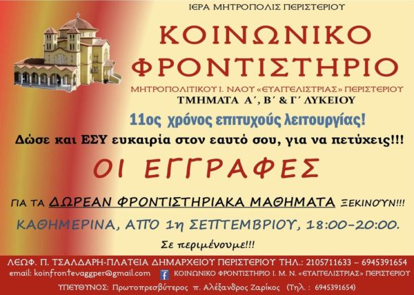 Εγγραφές στο Κοινωνικό Φροντιστήριο της Ευαγγελιστρίας Περιστερίου