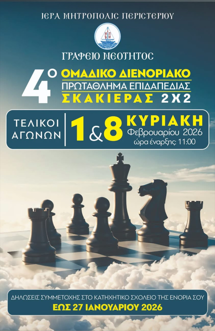 08/02/2026 08/02/2026 Το Γραφείο Νεότητος της Ιεράς Μητροπόλεως Περιστερίου υπό την ευλογία του Σεβασμιωτάτου Μητροπολίτη κ.Γρηγορίου με και με υπεύθυνο τον Διευθυντή π. Ραφαήλ Βουγιούκα διεξήγαγε με ιδιαίτερη επιτυχία στο αμφιθέατρο του Επισκοπείου της Ιεράς Μητροπόλεως τους Τελικούς Αγώνες του 4ου Ενοριακού Πρωταθλήματος Σκάκι. Στους τελικούς αγώνες συμμετείχαν τα παιδιά των κατηχητικών σχολείων των ακόλουθων ενοριών: Αποστόλου...