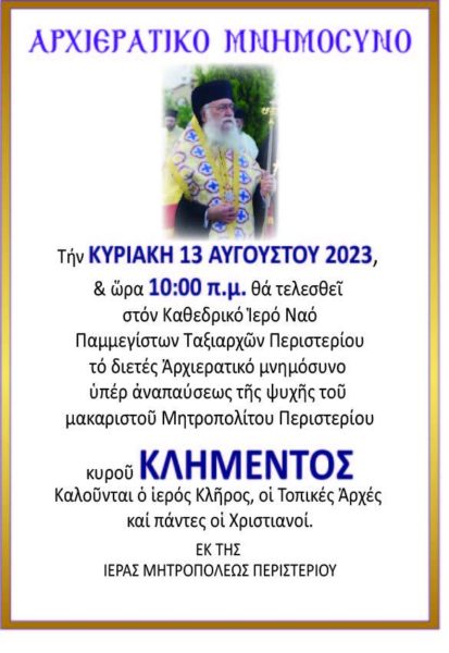 Την Κυριακή 13 Αυγούστου 2023 θα τελεσθεί, στον Ιερό Καθεδρικό Ναό Παμμεγίστων Ταξιαρχών, Αρχιερατικό Μνημόσυνο υπέρ αναπαύσεως της ψυχής του μακαριστού Μητροπολίτου Περιστερίου κυρού Κλήμεντος, με την συμπλήρωση δύο ετών από την προς Κύριον εκδημία του.