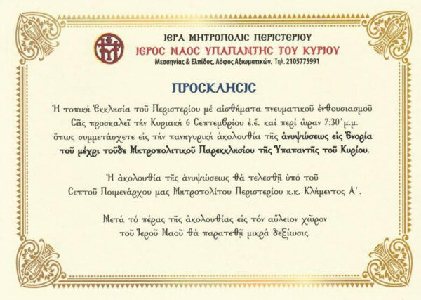 Πανηγυρική ακολουθία θα τελέσει ο Σεβασμιώτατος Μητροπολίτης Περιστερίου κ. Κλήμης στο Μητροπολιτικό Παρεκκλήσι της Υπαπαντής του Κυρίου στο Περιστέρι επ’ αφορμή της ανυψώσεώς του σε Ενορία! Η τοπική εκκλησία του Περιστερίου προσκαλεί το ποίμνιο στην ακολουθία της ανυψώσεως την προσεχή Κυριακή, 6 Σεπτεμβρίου, και ώρα 7.30 μ.μ. με αισθήματα πνευματικού ενθουσιασμού, ενώ ανακοινώνει πως μετά το πέρας της ακολουθίας θα παρατεθή μικρή δεξίωση!