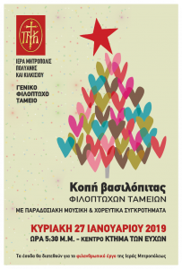 Όπως κάθε χρόνο έτσι και φέτος, η Ιερά Μητρόπολη Πολυανής και Κιλκισίου και το Γενικό Φιλόπτωχο Ταμείο διοργανώνουν χοροεσπερίδα αγάπης, την Κυριακή 27 Ιανουαρίου 2019, στις 5:30 το απόγευμα, στο Κέντρο “Κτήμα των Ευχών” του Κιλκίς.