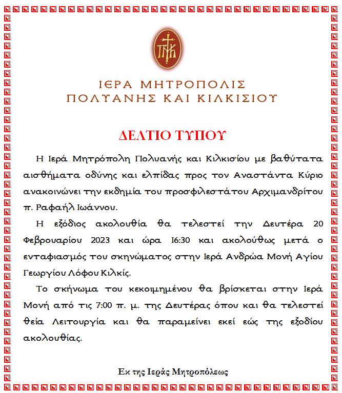 Με βαθύτατα αισθήματα οδύνης και ελπίδας προς τον Αναστάντα Κύριο η Ιερά Μητρόπολη Πολυανής και Κιλκισίου ανακοινώνει την εκδημία του Αρχιμανδρίτη π. Ραφαήλ Ιωάννου.