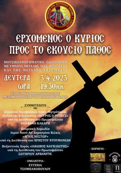 Ο Σύλλογος Ιεροψαλτών Ιεράς Μητρόπολης Πολυανής και Κιλκισίου «Πέτρος ο Γλυκύς» καλεί στο μουσικοαφηγηματικό οδοιπορικό με ύμνους της Μεγάλης Τεσσαρακοστής και της Μεγάλης Εβδομάδας με τίτλο «Ερχόμενος ο Κύριος προς το εκούσιο πάθος», τη Δευτέρα 3 Απριλίου στις 19:30, στον Ιερό Μητροπολιτικό Ναό Μεταμορφώσεως του Σωτήρος Κιλκίς.