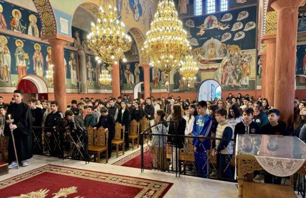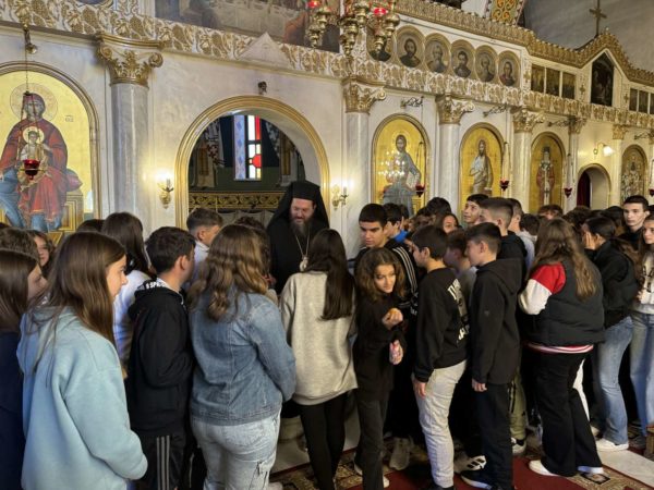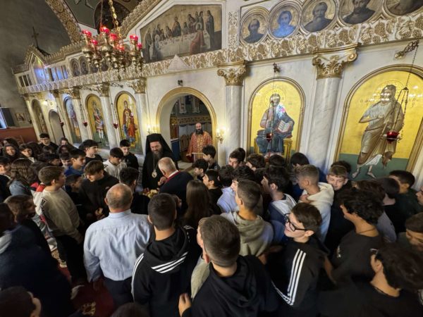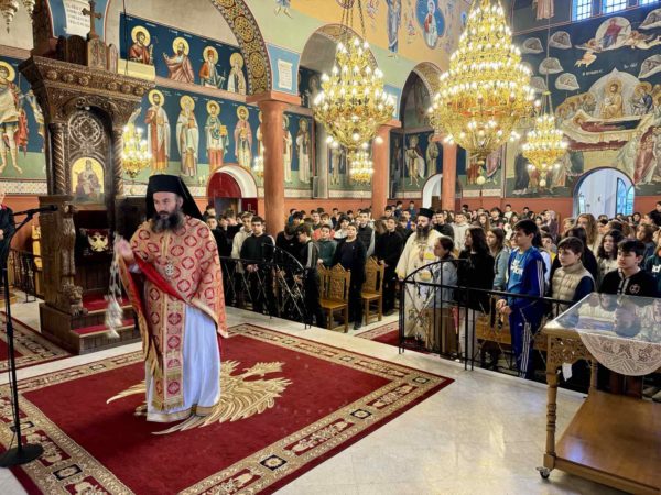 Στην προσλαλιά του προς το μαθητιώσα νεολαία αναφέρθηκε στις δύο μεγάλες εορτές που ετοιμαζόμαστε να τιμήσουμε, πρώτα του Αγίου Δημητρίου και έπειτα της Αγίας Σκέπης, παρουσιάζοντας τόσο το Μαρτύριο του Μεγαλομάρτυρος Δημητρίου που υπέστη γιατί παρέμεινε ακλόνητος στην πίστη του και κυρίαρχος στην αγάπη του για τον Χριστό, όσο και στην εορτή της Αγίας Σκέπης που υπενθυμίζει την σκέπη και την προστασία της Υπεραγίας Θεοτόκου στο Έθνος των Ελλήνων.