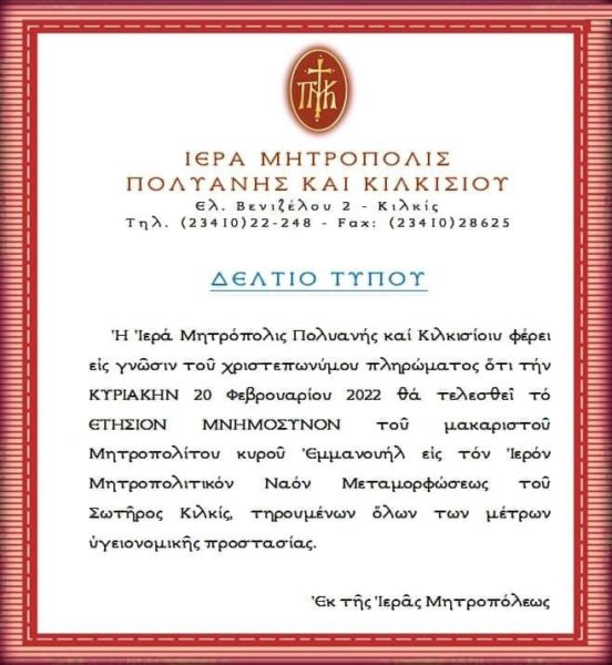 Την Κυριακή 20 Φεβρουαρίου στον Ιερό Μητροπολιτικό Ναό Μεταμορφώσεως του Σωτήρος Κιλκίς θα τελεσθεί το ετήσιο μνημόσυνο του μακαριστού Μητροπολίτη Πολυανής και Κιλκισίου κυρού Εμμανουήλ.