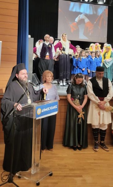 Παρόντος και του Δημάρχου Κιλκίς κ. Δημητρίου Κυριακίδη και εκπροσώπων της πολιτικής ζωής του τόπου, στο χαιρετισμό του ο Σεβασμιώτατος Μητροπολίτης Πολυανής και Κιλκισίου κ. Βαρθολομαίος αφού εξέφρασε εγκάρδιες ευχές και θερμά συγχαρητήρια, τόνισε την σπουδαιότητα του έργου του Λυκείου Ελληνίδων Κιλκίς στην πολιτιστική κληρονομιά, ενώ χαρακτήρισε την προσπάθειά τους ως εθνική προσφορά, παροτρύνοντάς τους να συνεχίσουν να υπηρετούν την παράδοση με τον ίδιο ζήλο και αγάπη.