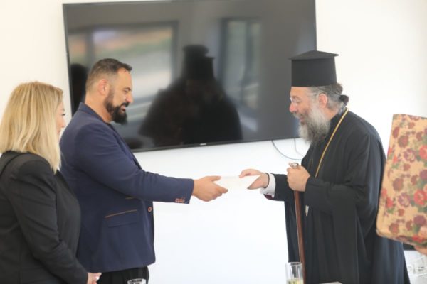 Ο Σεβασμιώτατος επέδωσε στον κ. Λαζανάκη αναμνηστικό δώρο και ευχαριστήριο γράμμα της Ιεράς Μητροπόλεώς μας για την συνεχή στήριξη και βοήθεια της Εταιρείας του για τις ανάγκες των εμπερίστατων αδελφών μας μέσω του Φιλοπτώχου Ταμείου της Τοπικής μας Εκκλησίας.