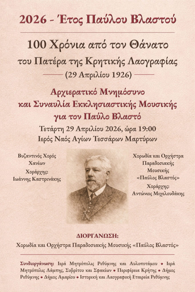 Η Οργανωτική Επιτροπή των εκδηλώσεων τιμής και μνήμης για την επέτειο των 100 χρόνων από τον θάνατο του Παύλου Βλαστού, πατέρα της Κρητικής Λαογραφίας, σας προσκαλεί στο Αρχιερατικό Μνημόσυνο υπέρ αναπαύσεως της ψυχής του, την Τετάρτη 29 Απριλίου 2026 και ώρα 19:00, στον Ιερό Ναό των Α-γίων Τεσσάρων Μαρτύρων πόλεως Ρεθύμνης.