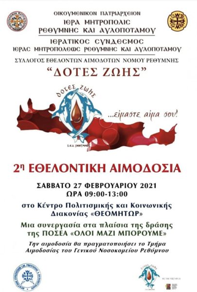 Τη 2η εθελοντική αιμοδοσία διοργανώνει το Σάββατο 27 Φεβρουαρίου 2021 από τις 9:00 π.μ. έως τις 13:00 μ.μ. στο Κέντρο Πολιτισμικής και Κοινωνικής Διακονίας «ΘΕΟΜΗΤΩΡ», στο λόφο του Τιμίου Σταυρού του Ρεθύμνου, η Ιερά Μητρόπολη Ρεθύμνης και Αυλοποτάμου, ο Ιερατικός Σύνδεσμος της Μητροπόλεως και ο Σύλλογος Εθελοντών Αιμοδοτών Νομού Ρεθύμνης “Δότες Ζωής”.