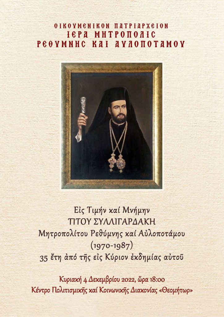 Η Ιερά Μητρόπολη Ρεθύμνης και Αυλοποτάμου απευθύνει πρόσκληση στις εκδηλώσεις τιμής και μνήμης που διοργανώνει για την συμπλήρωση 35 ετών από την εις Κύριον εκδημία του αοιδίμου Μητροπολίτη Ρεθύμνης και Αυλοποτάμου κυρού Τίτου (Συλλιγαρδάκη) το απόγευμα της Κυριακής 4 Δεκεμβρίου 2022, ημέρας εορτής της πολιούχου Ρεθύμνης Αγίας Μεγαλομάρτυρος Βαρβάρας της θαυματουργού, στους χώρους του Κέντρου Πολιτισμικής και Διακονίας «Θεομήτωρ».