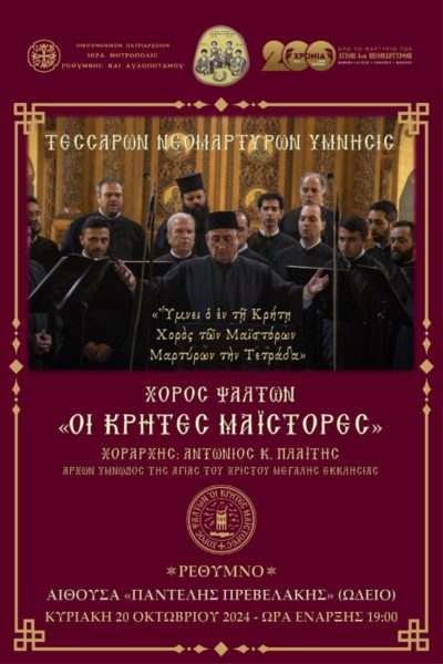 Το βράδυ της Κυριακής, στην αίθουσα «Παντελής Πρεβελάκης» (Ωδείο Ρεθύμνου), πραγματοποιήθηκε συναυλία βυζαντινής μουσικής με τίτλο: «ΤΕΣΣΑΡΩΝ ΝΕΟΜΑΡΤΥΡΩΝ ΥΜΝΗΣΙΣ – “Ύμνει ο εν τη Κρήτη Χορός των Μαϊστόρων Μαρτύρων την Τετράδα”», κατά την οποία ο Χορός Ψαλτών «Οι Κρήτες Μαΐστορες», υπό τη διεύθυνση του εντιμολογιωτάτου και μουσικολογιωτάτου κ. Αντωνίου Πλαΐτη, Άρχοντος Υμνωδού της Αγίας του Χριστού Μεγάλης Εκκλησίας και Πρωτοψάλτου του Ιερού Μητροπολιτικού Ναού Αγίου Μηνά Ηρακλείου Κρήτης, απέδωσε αριστοτεχνικά ύμνους από την Ακολουθία των Αγίων Τεσσάρων Νεομαρτύρων.