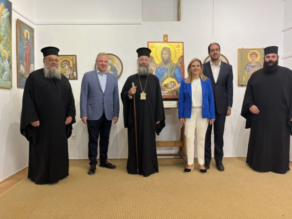 Επίσης, ο Σεβασμιώτατος, κατά τη μετάβασή του στην Ιερά Μονή Αρκαδίου, είχε τη χαρά να υποδεχθεί και να ξεναγήσει στους χώρους της Μονής, καθώς και στην Επετειακή 6η Έκθεση Αγιογραφίας και Ψηφιδωτού, που φιλοξενείται αυτήν την περίοδο στην Πινακοθήκη του Αρκαδίου, τον Υφυπουργό Εθνικής Άμυνας κ. Ιωάννη Κεφαλογιάννη, τον Υφυπουργό Αγροτικής Ανάπτυξης και Τροφίμων κ. Διονύσιο Σταμενίτη και την Βουλευτή Β1 Βορείου Τομέα Αθηνών της «Νέας Δημοκρατίας» κ. Ζωή Ράπτη, με τους οποίους είχε σύντομη συζήτηση στο Αρχονταρίκι της Μονής.