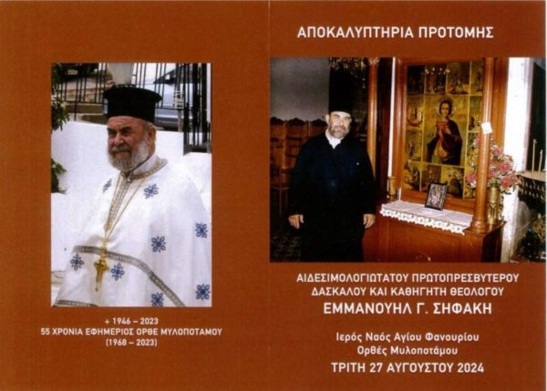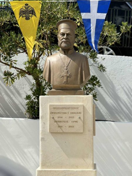 Στη συνέχεια, μετά την απόλυση της Θείας Λειτουργίας, στον προαύλειο χώρο του πανηγυρίζοντος Ιερού Ναού, πραγματοποιήθηκαν τα αποκαλυπτήρια της Προτομής του μακαριστού Πρωτοπρεσβυτέρου Εμμανουήλ Σηφάκη και εκφωνήθηκαν συγκινητικές ομιλίες, σύμφωνα με το πρόγραμμα, από τον διατελέσαντα μαθητή του μακαριστού π. Εμμανουήλ και Δήμαρχο Μυλοποτάμου κ. Γεώργιο Κλάδο, από τον Πρόεδρο της Τοπικής Κοινότητας Ορθέ, τον Πρόεδρο του Πολιτιστικού Συλλόγου Ορθέ, τον κ. Ανδρέα Εμμ. Ανδρουλιδάκη, επ. Αντιπρόεδρο του Νομικού Συμβουλίου του Κράτους, και την κ. Μαρία Λαγουδάκη, συνάδελφο του μακαριστού ιερέως στην Εκπαίδευση.