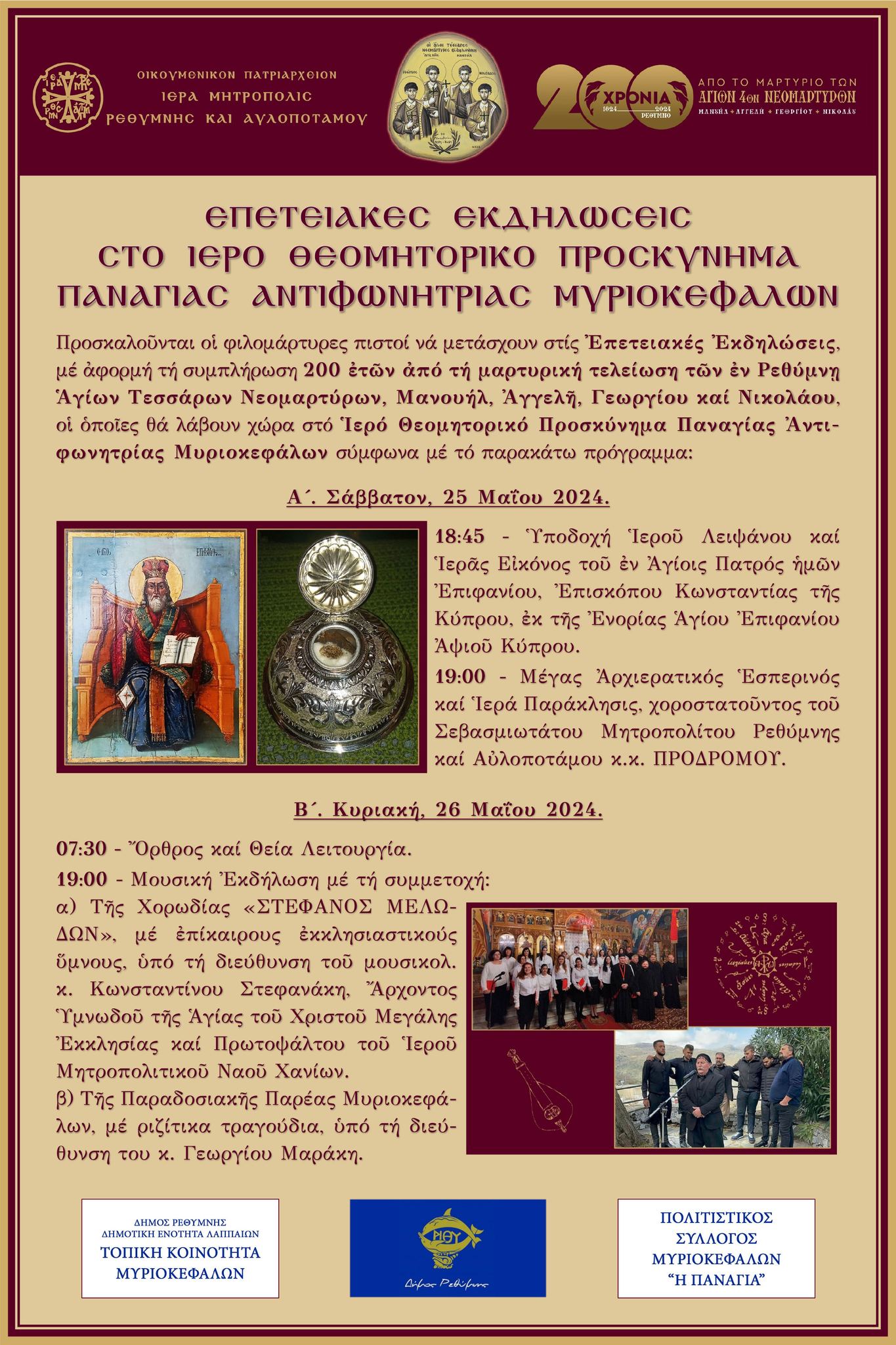 Επετειακές Εκδηλώσεις θα πραγματοποιηθούν με αφορμή τη συμπλήρωση 200 ετών από τη μαρτυρική τελείωση των εν Ρεθύμνη Αγίων Τεσσάρων Νεομαρτύρων, Μανουήλ, Αγγελή, Γεωργίου και Νικολάου, οι οποίες θα λάβουν χώρα στο Ιερό Θεομητορικό Προσκύνημα Παναγίας Αντιφωνητρίας Μυριοκεφάλων Ρεθύμνης.